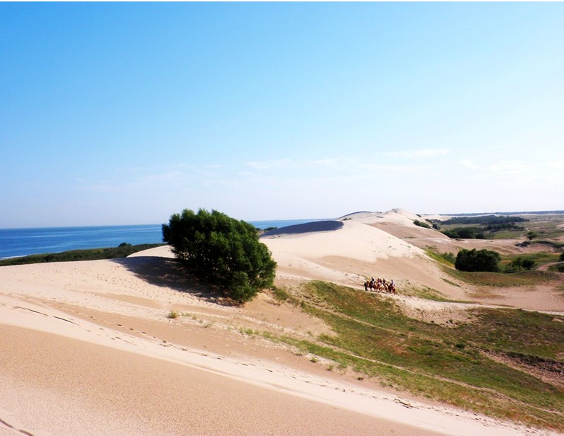 沙山“借得江南綠葉裝點(diǎn)半島翡翠,移來(lái)塞北黃沙成就大漠風(fēng)光。”風(fēng)景絕佳襲人之處,誰(shuí)來(lái)巧解天然之謎?進(jìn)入翡翠島景區(qū),放眼遠(yuǎn)眺,高大起伏的黃色沙丘連綿不絕,恍然如置身于戈壁大漠。翡翠島的大漠如長(zhǎng)龍臥波,從東面延伸過來(lái),然后呈30度角折向西南的海里。金色的沙丘,綿軟似綢緞,渾圓似巨蛋,曲線似魚脊,嫻靜似處子。不信你就來(lái)親身體驗(yàn)吧!
