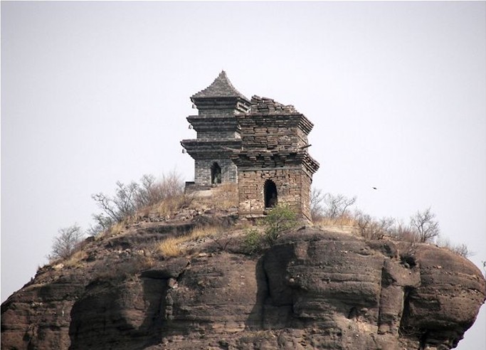 東、西、南三面墻是青磚壓縫,北墻齊縫直茬。1976年前北墻裂縫較大,寬處大約有20多公分,唐山大地震以后,磚塔不但沒(méi)倒,裂隙反而拼合。 峰頂各有磚塔一座,故名雙塔山。兩峰高低大體相同;北峰粗大,高40余米,周長(zhǎng)74米。南峰上粗下細(xì),周長(zhǎng)34米。雙塔山陡直而立,高不可攀,近代無(wú)人上去過(guò),峰頂磚塔何人、何時(shí)、何故所建,不得而知,一直是個(gè)謎;今人用望遠(yuǎn)鏡觀(guān)測(cè),北峰頂?shù)拇u塔高約2米,圓錐形,無(wú)門(mén)。南峰頂磚塔坐北朝南,高5米余,方形,邊長(zhǎng)2米多,門(mén)高約1.5米,寬1.3米,四角置木據(jù),有鐵棍挑出,上掛銅鈴。東、西、南三面墻是青磚壓縫,北墻齊縫直茬。1976年前北墻裂縫較大,寬處大約有20多公分,唐山大地震以后,磚塔不但沒(méi)倒,裂隙反而拼合。
