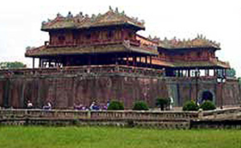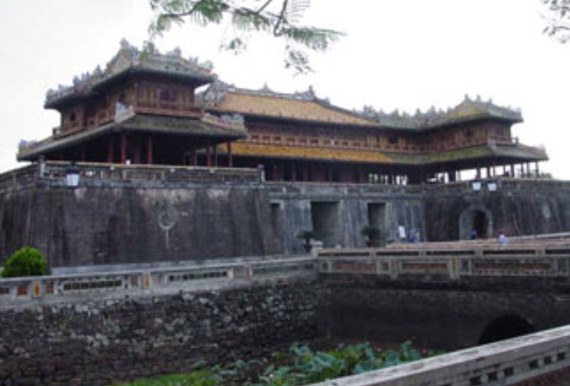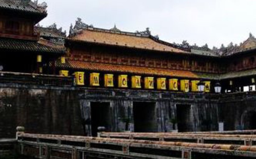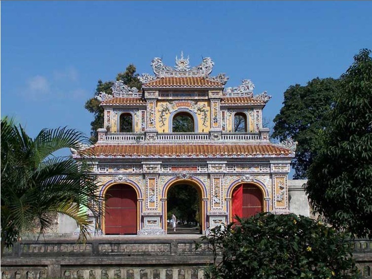 越南順化故宮正門。規(guī)模比中國(guó)北京故宮的午門小,但其式樣基本一樣。平面呈冂形,下有高大的磚石墩臺(tái),臺(tái)正面圍以垛墻。墩臺(tái)有5門,正中門高5.32米,寬3.28米,門正中上方有“午門”兩個(gè)大字。當(dāng)初字外包金,1943年12月10日包金被竊。墩臺(tái)上建樓5座,名五鳳樓,樓分兩層,氣勢(shì)巍峨。下層正中是“御座”。上層為各宮人觀禮之所。當(dāng)時(shí),午門只在慶典節(jié)日開放。午門也是阮氏王朝被埋葬的見證,1945年8月30日阮朝末代皇帝被迫在此正式宣布遜位,并把金印和寶劍交給越南臨時(shí)政府代表團(tuán)。午門建于阮朝明命十四年(公元1833年),啟定三年(1921年)重修。抗戰(zhàn)期間遭炮火破壞,現(xiàn)已修復(fù)。以前,阮朝嘉隆初年曾在午門現(xiàn)址建有南闕臺(tái)。