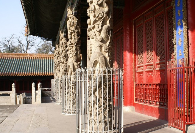大成殿為孔廟之主殿,唐代稱“文宣王殿”。“大成”乃因宋徽宗趙倩尊孔子為“集古圣先賢之大成”而改名為“大成殿”,并御書匾額。大成殿不僅殿宇宏大,裝飾華麗,為全國孔廟之冠,而且此殿前檐十根雕龍石柱,龍姿飛揚,為宮殿建筑中前所未見,連紫禁城的龍柱也相形見細。據(jù)傳每當皇帝前來祭孔時,要將龍柱用紅縷包裹起來,以免皇帝發(fā)現(xiàn),犯殺頭之罪。殿內(nèi)正中奉把孔子塑像,兩旁為四配和十二哲的塑像。殿前東西民廊原供孔門弟子及儒家歷代先賢,現(xiàn)已辟為陳列室,陳列著歷代碑刻,為書法、繪畫、雕刻的藝術(shù)寶庫。寢殿后的圣跡殿,藏有明代石刻連環(huán)畫120幅,記述了孔于的業(yè)跡。故宅井后的魯壁為秦始皇焚書坑儒時,孔子第九代孫孔鮑收藏《尚書》、《禮記》、《論語》、《孝經(jīng)》等的夾墻,人們?yōu)榱思o念孔鮑保護古代文化的功績,特地修建了這個魯壁。