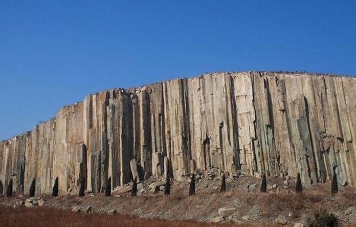 據(jù)考證,此山是1億多年前由火山巖漿冷凝而成,現(xiàn)裸露部分高達(dá)28米,厚約 30米,跨度達(dá) 150米。柱狀節(jié)理石柱群由無數(shù)根直徑一米左右、呈四棱、五棱或六棱柱狀的單個(gè)柱體緊密排列組成,氣勢(shì)雄偉,非常壯觀。柱體內(nèi)含有許多安山巖氣孔晶洞,洞內(nèi)有大量的方解石、冰洲石晶體,呈菊花瓣?duì)?,具有極高的經(jīng)濟(jì)價(jià)值、觀賞價(jià)值和科研價(jià)值。尤其在安山巖中,發(fā)現(xiàn)此柱狀節(jié)理在我國(guó)尚屬首列,是世界柱狀節(jié)理石柱三大奇觀之一,從規(guī)模和科研價(jià)值上,都可與世界聞名的英國(guó)玄武巖狀節(jié)理“巨人堤”和美國(guó)響巖體柱狀節(jié)理“魔鬼塔”相媲美。