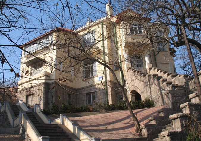 穿過兩扇雕花的鐵柵欄大門,正對著大門的是一段寬敞的沿地勢而建的臺階,拾階而上,臺階向兩邊分開,之后繞過一面造型古樸的壁墻,進入高處的院內(nèi),再通過石階才能進入居室。洪深故居是一座二層樓的德式建筑,高大的門廳,拱形窗戶,青磚灰瓦,歌特式的屋頂,十分的寬敞和氣派。通過后來的了解,這處洪深舊居也正是青島現(xiàn)代文化名人故居中,最為“闊綽”的一處。