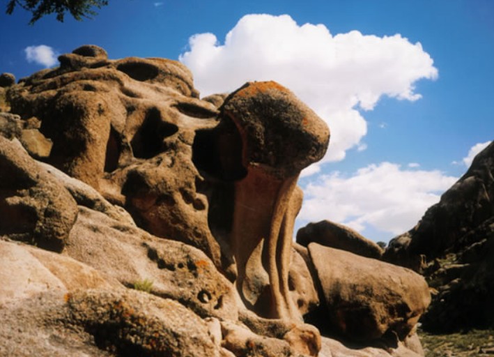 觀山猶海,哈不茨蓋怪石林(神石溝)一群率真又爽快的朋友相邀,一個(gè)富于蠱惑而神奇的召喚,一個(gè)有關(guān)山石鬼魅空靈的話(huà)題,一個(gè)久遠(yuǎn)的神往,于是,在陣雨迷離的清晨,我們結(jié)伴向著諾爾公“神石溝”出發(fā)了。 一路,漠原底色的焦黃在濃重陰云的籠罩下,淺淺雨韻的滋潤(rùn)里,陡然生出一些新綠的況味。這時(shí)一個(gè)關(guān)于生命的感悟,關(guān)于自然與人的和諧審美,沿著那條鋪向遠(yuǎn)天緞帶般的路面。