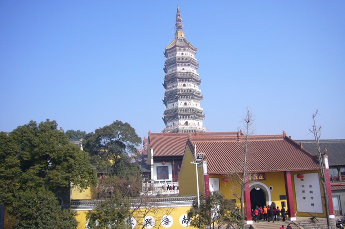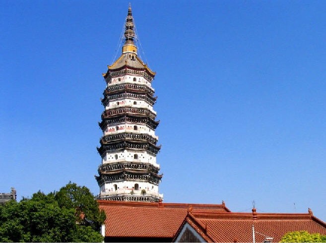 振風(fēng)塔矗立寺中,建于明隆慶四年(1570年),原名“萬(wàn)佛塔”,是長(zhǎng)江流域少見(jiàn)的迎江七級(jí)浮圖。遠(yuǎn)看如同一直立的圓錐體,挺拔秀麗,氣勢(shì)雄偉;近看由磚石砌成的樓閣式建筑,嵌空玲瓏,莊重華美。該塔七層八角,內(nèi)共有168級(jí)臺(tái)階,每層有石欄環(huán)衛(wèi)。塔中心為八角瓜皮頂空廳。
