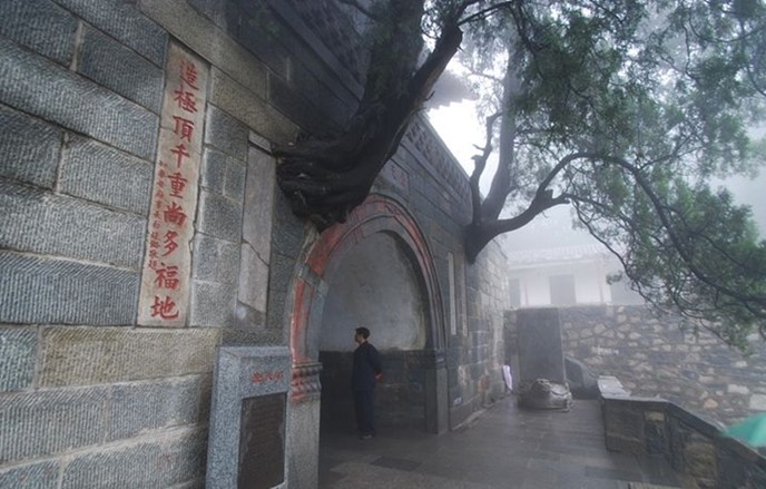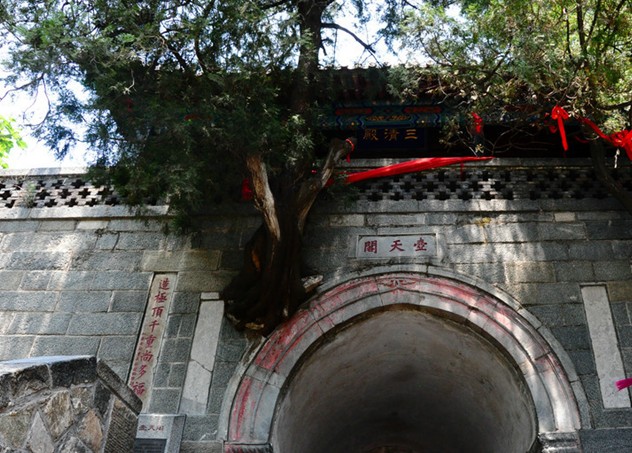 清嘉慶六年即公元1801年泰安太守崔映辰題聯(lián):“壺天日月開靈境,盤路風云入翠微。”嘉慶二十一年即公元1816年泰安府事廷璐又聯(lián):“登此山一半已是壺天,造極頂千重尚多福地。”這里海拔為800米,大致是泰山高度的一半,門洞有雙柏自墻中橫生,東西對峙,盤旋而上,宛如守護山門的雷祖、真武二將軍,堪稱奇景。