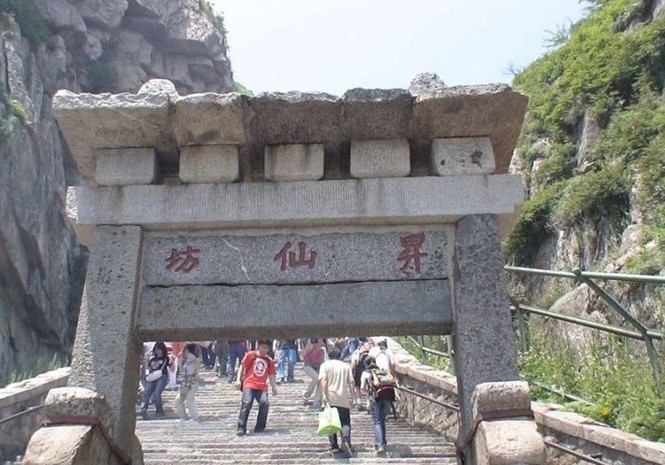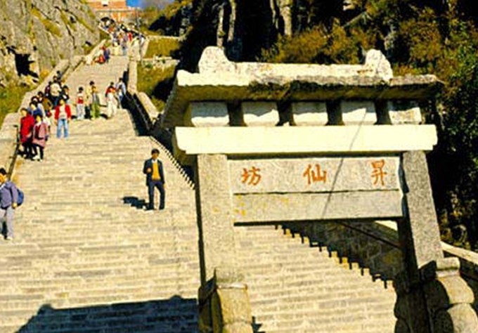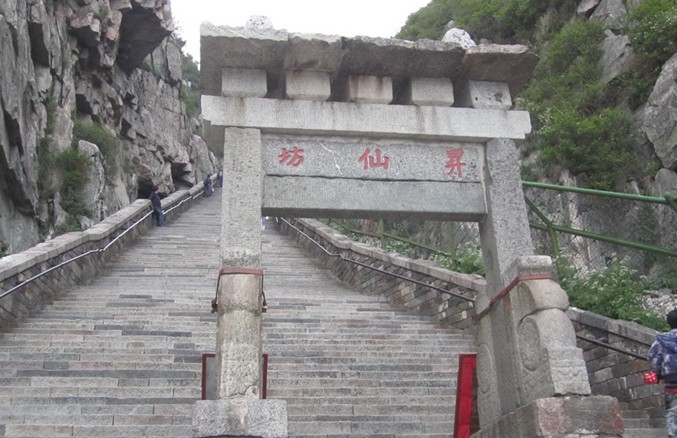 升仙坊位于山東省泰山中路緊十八盤的起始處,為兩柱單門式石坊,額題楷書“升仙坊”。此處山勢陡峻,懸崖峭壁,上臨岱頂天庭,咫尺仙境,似有飄然升仙的意境,故名“升仙坊”。游人至此小憩,每每浮想聯(lián)翩?;匾暽较?,常有騰身云霄之感,舉首仰望,南天門近在眼前,奮力攀登,岱頂在望。 升仙坊位于南天門下。全石雙柱單門式,寬2.82米,通高4.5米,建于雙層方 石基上?;L1.82米,寬0.64米,高0.5米。柱方形,下施滾墩石,獸頭石鼓狀。