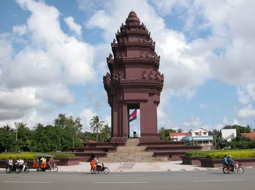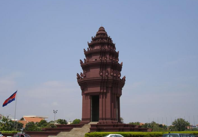 獨立紀(jì)念碑(Independent Monument)高高地矗立在諾羅敦大道與西哈努克大道交會的十字路口上。為慶祝脫離法國殖民政權(quán)和紀(jì)念在戰(zhàn)爭中為國犧牲的英勇烈士而建。由柬埔寨著名設(shè)計師凡•莫尼旺設(shè)計,于1958年動工興建,1962年11月落成。整座紀(jì)念碑底座寬36米、高37米。