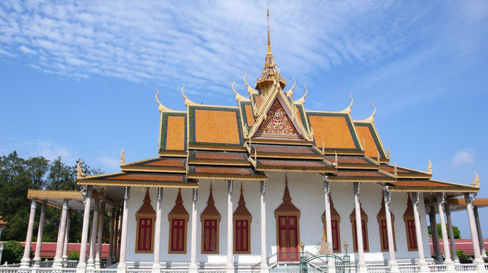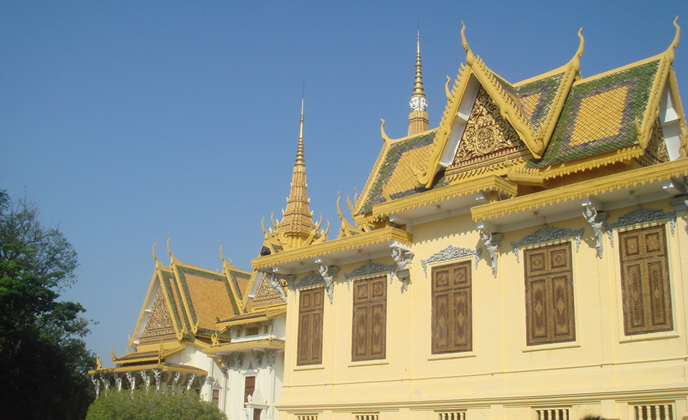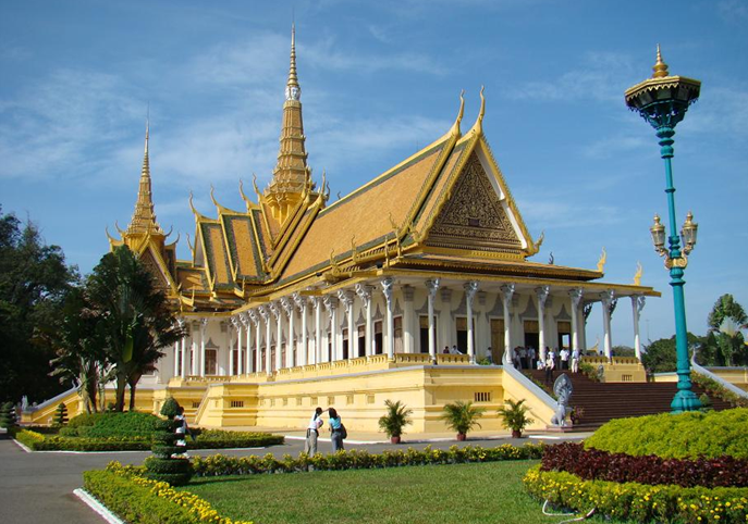 金邊皇宮(Royal Palace),也稱四臂灣大皇宮,建造于1866-1870年 。坐落于金邊東面,面對(duì)湄公河、洞里薩河、巴沙河交匯而形成的四臂灣,屬于典型的高棉式建筑。王宮為長(zhǎng)方形,長(zhǎng)435米,寬402米,外有城墻,里面共有20余座建筑物。建筑極富高棉傳統(tǒng)風(fēng)格和宗教色彩,多為黃、白兩色,黃色代表佛教,白色代表婆羅門教,所以看上去金燦燦的。