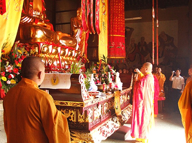 大雄寶殿是法華院的主體建筑,它依山面南而座,殿內(nèi)供奉佛祖釋迦牟尼,因他大智大勇,無(wú)敵于邪惡,故人們尊稱其為“大雄”。“大雄寶殿”四個(gè)大字為原全國(guó)佛教協(xié)會(huì)會(huì)長(zhǎng)趙樸初先生所題。立于佛祖兩旁分別是他的兩個(gè)弟子大迦葉和阿難尊者 。大殿東、西、北三面墻壁繪有文殊菩薩、普賢菩薩和十八羅漢,壁畫(huà)描繪的生動(dòng)、精美。