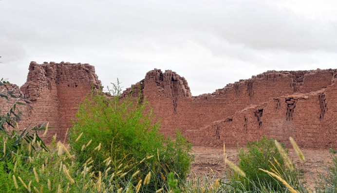 大方盤城(斯坦因編號T18) 位于小方盤城東北約11公里,北距疏勒河 1.2公里,漢代倉儲遺址。平面呈長方形,東西長 134.8米,南北寬18米,有內(nèi)外兩重圍墻。殘墻最高 7.6米。內(nèi)有倉庫三間,南北墻上下各有一排對稱的三角形通風(fēng)孔。倉庫內(nèi)外及其附近曾出土漢簡和西晉泰始十一年 (275)刻石。