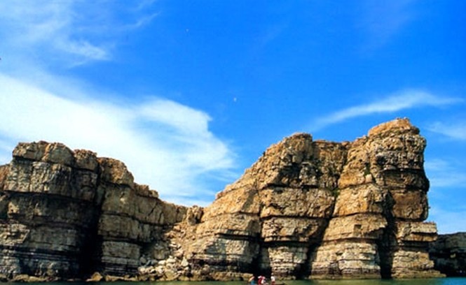 九丈崖位于北長山島的西 北角,西依珍珠門水道,北鄰國際航線長山水道,距長島縣城11公里。山崖險(xiǎn)峻,水深流急,巖礁棋布,自然景觀獨(dú)樹一幟。崖壁綿延400余米,尤以其崖壁罕見的石質(zhì)組合和高峻險(xiǎn)要而著稱,版權(quán)所有山東聊城聊之旅國際旅行社有限公司,轉(zhuǎn)載必究!在全國眾多海蝕崖中獨(dú)占鰲頭。景區(qū)集山、海、礁、崖、洞及古跡于一體,融奇、雄、秀、美、險(xiǎn)、神于一身,具有很高旅游和美學(xué)價(jià)值。九丈崖主要景點(diǎn)有:峭壁燕梭(九丈崖),高69.7米,是一綿延幾百米的巨崖,由于千萬年來風(fēng)浪的侵蝕,石崖漸成了上凸下凹之勢,壁面犬牙交錯(cuò),石窟、石穴鱗次櫛比,是眾多水鳥棲息的樂園。九疊石塔,由九層節(jié)理明顯的石英巖堆成,久經(jīng)海浪磨蝕雕鑿,塔崖石紋清晰,層次分明,形態(tài)別致,與九丈崖組成一對(duì)”母子崖“。水門賞古,珍珠門東側(cè)大西山腳下有塊平緩地,當(dāng)?shù)厝私?rdquo;平灘“,據(jù)出土文物證明,早在四、五千年前這里就有游民季節(jié)性居住,經(jīng)北京大學(xué)與長島博物館兩次挖掘,發(fā)現(xiàn)多處窯坑、灰坑和葬墓,出土了青銅戈、石刀、石錘、骨錐、骨匙和大量紅褐色、灰褐色面陶器及紋飾陶器。八仙石洞,為兩處海蝕大洞,大的深30余米,寬5米,洞頂近似拱門,傳說當(dāng)年八仙曾在此聚會(huì),洞內(nèi)石英巖面凹凸錯(cuò)落,玲瓏剔透。大洞毗鄰處有一小洞,寬1米多,深20余米,洞內(nèi)設(shè)有石桌、石床,上開兩扇天窗,傳說是何仙姑的寢室。龍舌垂釣,因一礁石酷似龍舌伸出海面而得名。龍舌與門檻礁、鞭桿礁、蜘蛛礁、猴子礁天然形成一個(gè)良好的垂釣場,這里海水通暢,洞穴密集,是釣魚的理想之地。