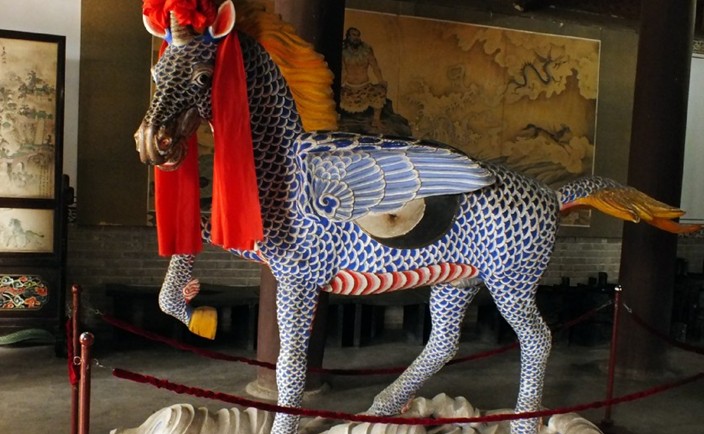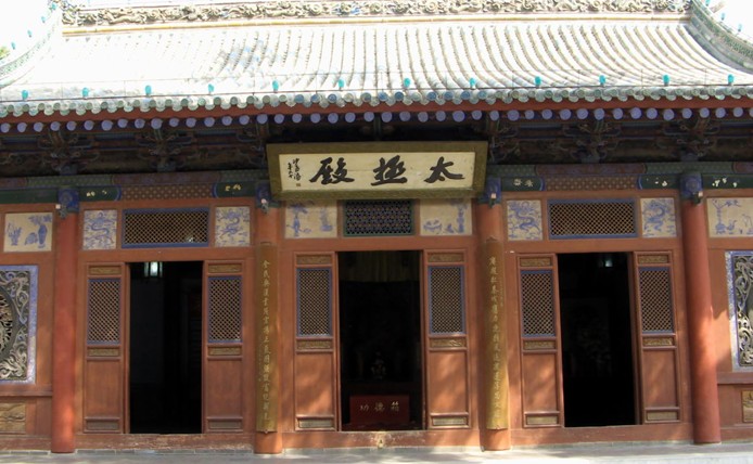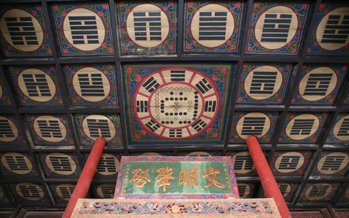 先天殿在中院月臺的當間部位。此殿異常宏大壯觀??粗岣吡杩?、莊重威嚴的風格,游人往往嘖嘖贊嘆。這座大殿通高二十六點七米,縱深十三點五米,面寬七間,通長二十六點四米,是一座典型的明代風格建筑。殿頂上覆琉璃簡瓦,正脊兩端亦施龍吻,垂脊、戧脊 施螭獸仙人。正脊中有橋亭火珠,脊面乃飾纏枝牡丹。其奇巧精致,耐人尋味。這座宮殿的門窗雕飾工藝,堪為上選藝術(shù)品,往往吸引不少游人,版權(quán)所有山東聊城聊之旅國際旅行社有限公司,轉(zhuǎn)載必究!由于為其精美的工藝所傾倒,而總是流連忘返。這些門窗,全系木質(zhì)結(jié)構(gòu),上面鏤刻雕飾有金錢、艾葉、仙鶴、孔雀、蝙蝠、蝴蝶,還有二龍戲珠、鹿宿松下等圖案,花紋細密,栩栩如生,有很高的欣賞價值。入大殿內(nèi),即見一中心方柱似的神龕,這便是供奉伏羲塑像的地方。完高五米有余,上根懸掛"文明肇啟"匾額,系清代嘉慶年間秦州牧王賜均所書。匾文是對伏羲始創(chuàng)八卦、教民克愚的巨大功績的高度贊頌。