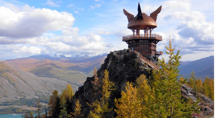 觀魚亭建于海拔2030米的哈拉開特(蒙古語意為駱駝峰)山頂上,與湖面的垂直落差達(dá)600多米,因處于觀察“湖怪”的最佳位置,故得名觀魚亭。