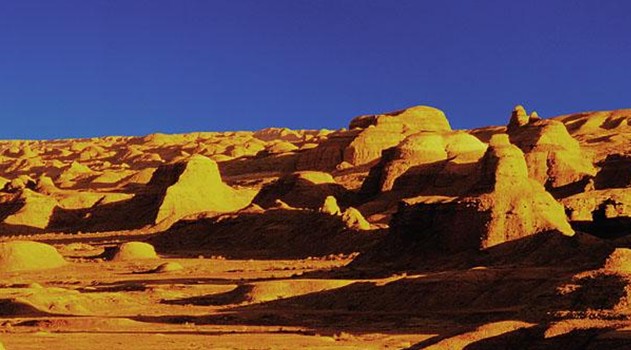 克拉瑪依市北行100公里,在烏爾禾鄉(xiāng)東南三公里,有一處獨特的風蝕地貌,定名為風城,人們習慣稱它為 “魔鬼城”。“魔鬼城”是一片雅丹地貌,面積10平方公里,地面海拔350米左右。