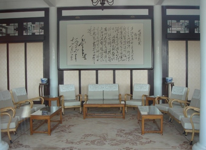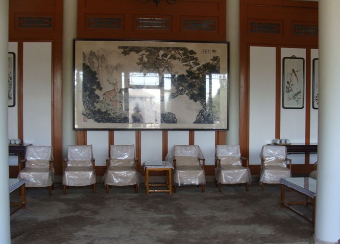 前客廳一共有五間房屋??繓|靠西的各一間用布簾與中間相隔,使中間三間室內(nèi)顯得靜謐祥和。周恩來接見外賓、會見客人等均在這中間三間房里舉行,周恩來一般坐在東邊主席位置上,西邊是主要客人的客席座位,會見時如用翻譯,就在后邊加上兩把椅子和一只小茶幾就行了。兩側(cè)是主要陪同人員坐位,如果隨行陪同人員太多,也可以臨時多放幾把椅子。周恩來在建國初期曾在這里會見原蘇聯(lián)駐中國大使羅申,原印尼總統(tǒng)蘇加諾等人。一般東側(cè)布簾內(nèi)的那間房子里放置有茶水、茶具。版權(quán)所有山東聊城聊之旅國際旅行社有限公司,轉(zhuǎn)載必究!這樣好方便工作人員隨時送上;西側(cè)布簾內(nèi)的那一間放置有小圓桌兩張。周恩來有時會見國內(nèi)外的知心客人或朋友時,談到吃飯時間了,為了節(jié)省時間,也會讓工作人員在后邊簡易鍋灶上燒幾個菜招待客人,邊吃邊談,吃完飯繼續(xù)談。象越南的胡志明主席、柬埔寨的西哈努克親王、國內(nèi)的廖承志同志等都在大廳里和周恩來一起用過餐。