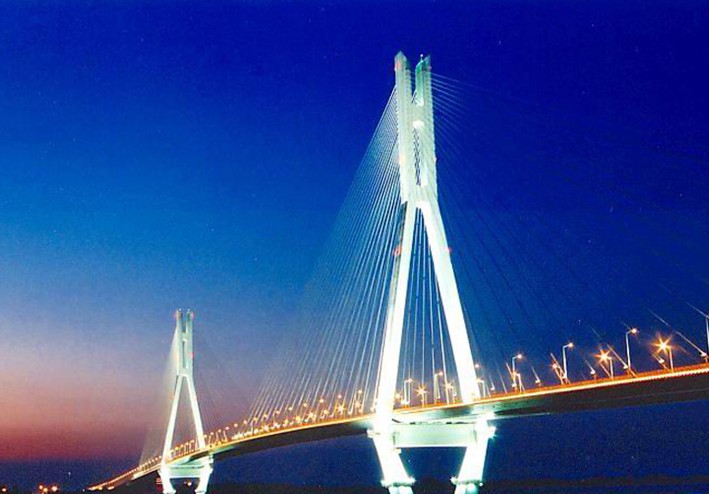 南京長江二橋是國家“九五”重點(diǎn)建設(shè)項目,位于現(xiàn)南京長江大橋下游11公里處,全長21.337公里,由南、北汊大橋和南岸、八卦洲及北岸引線組成。其中:南汊大橋為鋼箱梁斜拉橋,橋長2938米,版權(quán)所有山東聊城聊之旅國際旅行社有限公司,轉(zhuǎn)載必究!主跨為628米,該跨徑目前居同類橋型中“國內(nèi)第一,世界第三”;北汊大橋為鋼筋混凝土預(yù)應(yīng)力連續(xù)箱梁橋,橋長2172米,主跨為3×165米,該跨徑在國內(nèi)亦居領(lǐng)先。全線還設(shè)有4座互通立交、4座特大橋、6座大橋。設(shè)計標(biāo)準(zhǔn):雙向六車道高速公路;設(shè)計速度:100公里/小時;設(shè)計荷載:汽——超20,掛——120;路基寬33.5米,橋面寬32米(不含斜拉索錨固區(qū))。全線設(shè)有監(jiān)控、通訊、收費(fèi)、照明、動靜態(tài)稱重等系統(tǒng),并設(shè)有南汊主橋景觀照明,南、北汊橋公園和八卦洲服務(wù)區(qū)。
