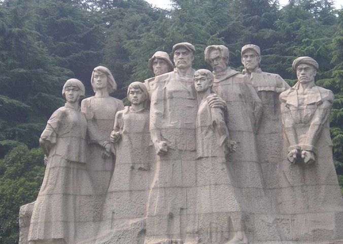 雨花臺(tái)陵園大門由花崗石砌成,高11.7 米。大門內(nèi)三面環(huán)山的廣場(chǎng)上聳立著一座烈士群雕,雕像高10.3米、寬14.2米,由179塊花崗石拼裝而成,是我國目前最大的花崗石群雕。雕像采用了上實(shí)下虛的手法,著重刻劃了烈士的面部神態(tài)。兩側(cè)的環(huán)陵大道可直達(dá)雨花臺(tái)主峰,主峰上矗立著一塊4.23 米高的石碑,碑身正面鐫刻著鄧小平親筆題寫的"革命烈士紀(jì)念碑"七個(gè)金字,背面刻著紀(jì)念碑文。碑前還豎有一座高5.5米的烈士青銅塑像。在紀(jì)念碑南邊的山崗上還有一座呈"U "字型,頗具民族風(fēng)格的花崗巖結(jié)構(gòu)的大型建筑--"革命烈士紀(jì)念館"。館長94米、寬49米,主堡高26米,建筑面積5900平方米,館內(nèi)陳列著烈士們的遺像、遺書和遺物等。