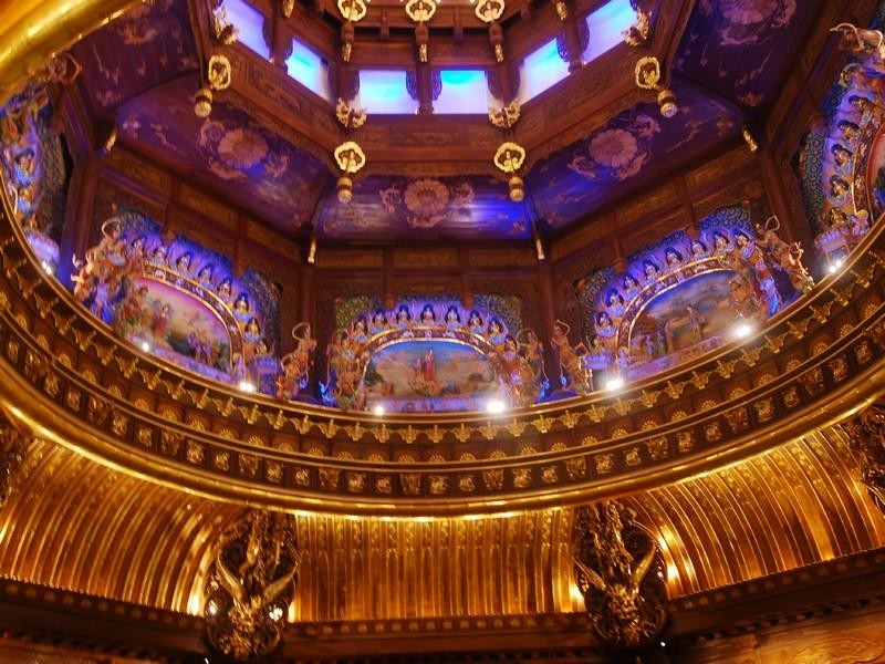 梵宮內(nèi)部各建筑空間獨立且互相貫通,由門廳、廊廳、塔廳、圣壇、三傳會議廳、千人宴會廳等組成。精雕細琢的東陽木雕、敦煌技師的手工壁畫、光燦奪目的琉璃巨制、精致典雅的甌塑浮雕壁畫、技藝精湛的揚州漆器、恢宏大氣的油畫組圖、古雅精麗的景泰藍須彌燈、精美的景德鎮(zhèn)青花斗彩缸……這些匯集眾多文化遺產(chǎn)、眾多藝術(shù)瑰寶的藝術(shù)珍品遍布靈山梵宮的各個區(qū)域,將優(yōu)秀的傳統(tǒng)文化演繹得淋漓盡致,令人目不暇接、回味無窮。