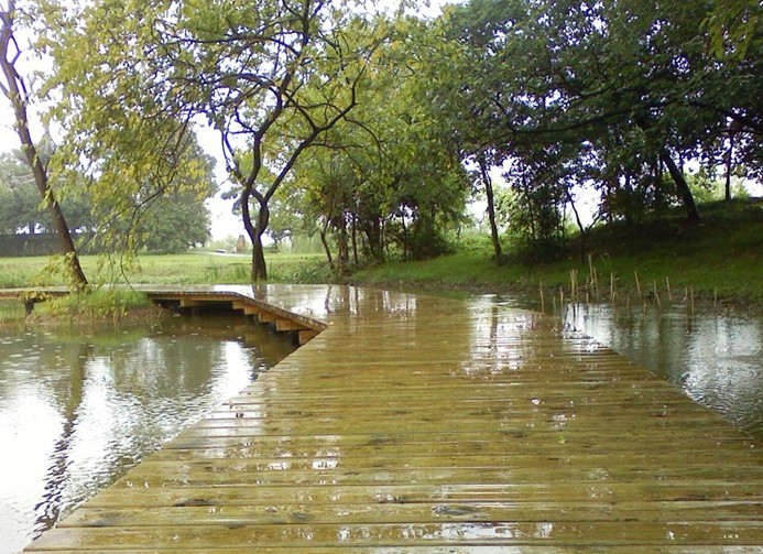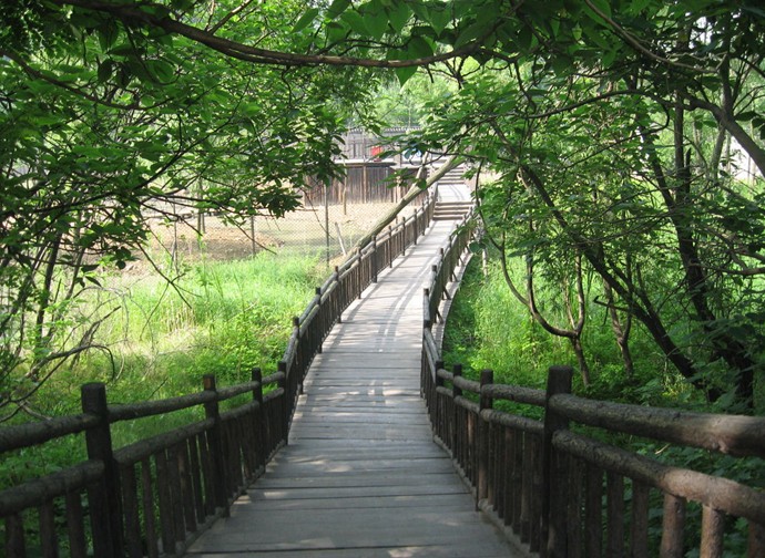 進入景區(qū)大門映入眼簾的是一座傍依古運河畔仿樹樁造型的曲橋,橋長百米,橋曲形美,橋韻古樸。每當夏季來臨,滿塘荷葉圓如蓋,清香四溢,花燦如霞。在曲橋的魚池中,放養(yǎng)著數(shù)萬條日本錦鯉和其它觀賞金魚,大的體寬如碗口,水光晃漾,令人陶醉。
