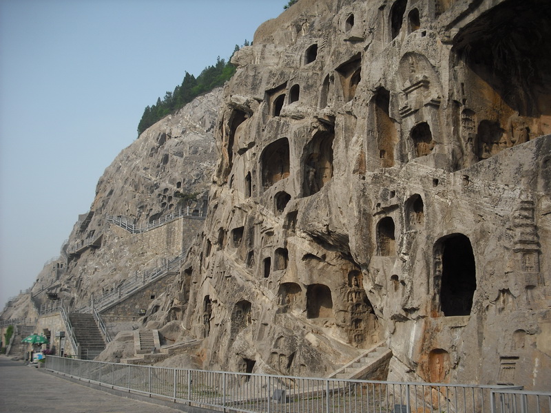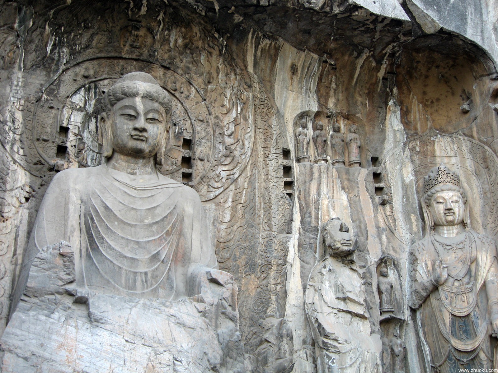 龍門石窟開鑿于北魏孝文帝遷都洛陽之際(公元493年),之后歷經(jīng)東魏、西魏、北齊、隋、唐、五代、宋等朝代400余年的營造,其中北魏和唐代大規(guī)模營建有140多年,從而形成了南北長達1公里、具有2300余座窟龕、10萬余尊造像、2800余塊碑刻題記的石窟遺存。在龍門的所有洞窟中,北魏洞窟約占30%,唐代占60%,其他朝代僅占10%。龍門石窟中最大的佛像盧舍那大佛,通高17.14米,頭高4米,耳長1.9米;最小的佛像在蓮花洞中,每個只有2厘米,稱為微雕。