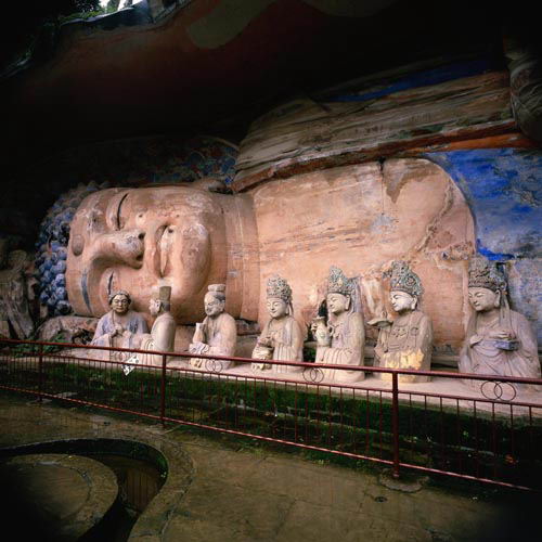 這是擂鼓臺中洞,又名大萬伍佛洞。是一座武周禪宗窟,中國佛教的禪宗是以專修禪定為主的教派。“禪定”就是安定而止息殺慮的意思。洞頂作穹隆形,并有裝飾華麗的蓮花藻井,造像是一佛二菩薩,主佛為雙膝下垂而坐的彌勒佛,壁基有二十五尊高浮雕羅漢群像,從南壁西起到北壁西止。羅漢群像構(gòu)成一個半環(huán)形裝飾帶,羅漢群像均羅漢身旁都刻有一段從《付法藏因緣傳》里摘錄的經(jīng)文介紹該羅漢的身世及特點。所刊經(jīng)文中多雜以武周新字,這是是武周時期禪宗所經(jīng)營的洞窟。