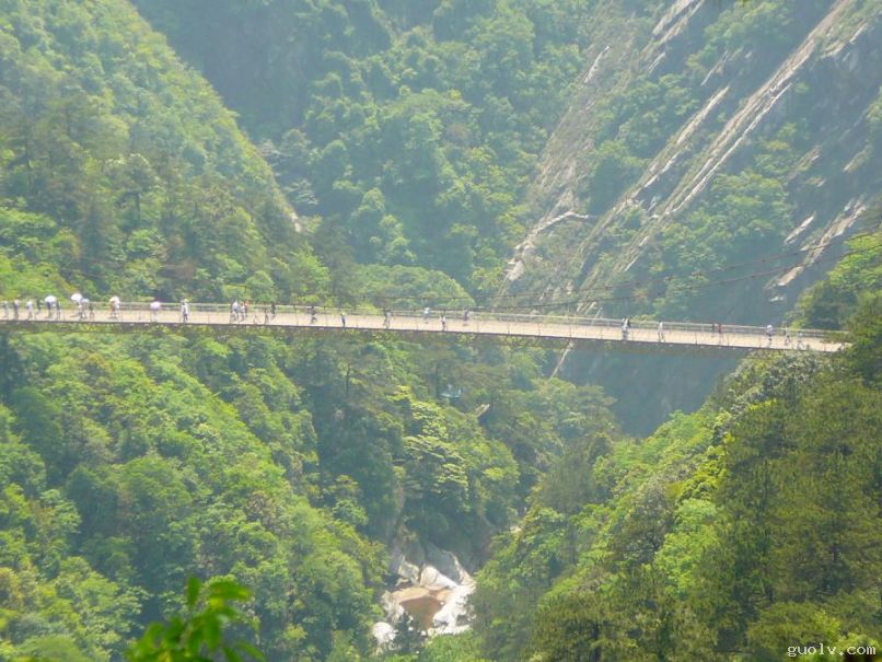 三疊泉位于五老峰下部,飛瀑流經(jīng)的峭壁有三級(jí),溪水分三疊泉飛瀉而下,落差共155米,極為壯觀,撼人魂魄。 三疊泉每疊各具特色。一疊直垂,水從20多米的巔萁背上一傾而下;二疊彎曲,直入潭中?!吧霞?jí)如飄雪拖練,中級(jí)如碎玉摧冰,下級(jí)如玉龍走潭?!?站在第三疊抬頭仰望,三疊泉拋珠濺玉,宛如白鷺千片,上下?tīng)?zhēng)飛;又如百副冰綃,抖騰長(zhǎng)空,萬(wàn)斛明珠,九天飛灑。如果是暮春初夏多雨季節(jié),飛瀑如發(fā)怒的玉龍,沖破青天,凌空飛下,雷聲轟鳴,令人嘆為觀之。(三疊泉門票64元/人)
