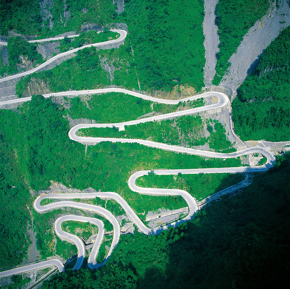 天門洞以其接地通天的態(tài)勢,成為人們心中通天的門戶,而通往天門洞的盤山公路也因此被稱為“通天大道”。更為神奇的是,在公路竣工的時(shí)候,人們驚奇地發(fā)現(xiàn),這條順山勢修建的通天大道剛好九十九個(gè)彎,暗合了“天有九重,云有九霄”之意。 通天大道以進(jìn)山時(shí)的標(biāo)志門為起點(diǎn),一直通達(dá)天門洞腳下,全長 10.77 公里 ,但就在這么短的距離里,它的海拔卻從 200 米 急劇提升到了 1300 米,大道兩側(cè)絕壁千仞,空谷幽深,180 度的急彎此消而彼,層層疊起,“ 堪稱天下第一公路奇觀 ”。中國書法協(xié)會(huì)常務(wù)副會(huì)長沈鵬先生走過通天大道后欣然為其題字“曲道通天”,字體遒勁挺拔,與通天大道的奇絕天下相融為一體。通天大道于 1998 年開始修建,因天門山獨(dú)特的地質(zhì)和氣候所局限,至 2005年全面貫通,歷時(shí)八年,共耗資 1 億元人民幣。整個(gè)工程充滿著艱辛卓絕,它凝聚著全體施工人員的智慧和心血,其勢驚險(xiǎn)奇絕,蕩氣回腸,以蜿蜒迂回穿行于山體絕壁之天險(xiǎn)而成為天下第一公路奇觀。