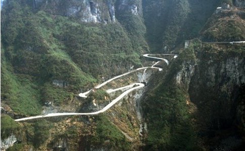 天門山盤山公路共有九十九道急彎,其中最為險(xiǎn)峻的一段是經(jīng)過科學(xué)的論證及設(shè)計(jì)才得以修建成功的,大家可以通過圖片看到其中公路之險(xiǎn)峻。