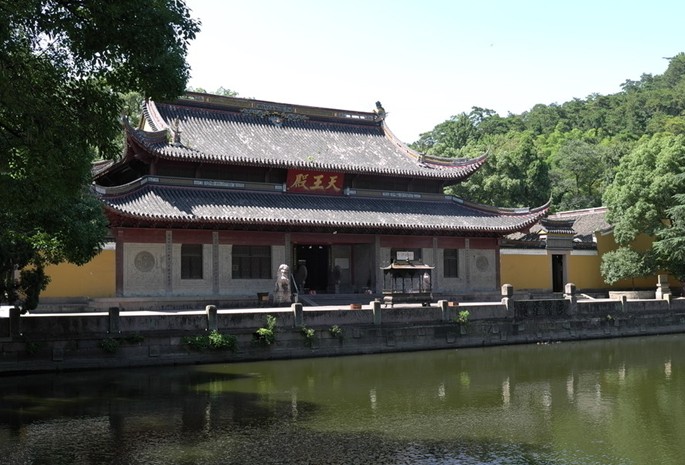 阿育王寺--全國重點(diǎn)佛教寺院,位于鄞縣寶幢鎮(zhèn)。現(xiàn)存殿、堂、樓、閣600余間,依山坡構(gòu)筑。中軸線上依次為山門、二山門、放生池、天王殿、大雄寶殿、舍利殿、法堂和藏經(jīng)樓。右側(cè)有云水堂、鄮峰草堂、拾翠樓、祖師殿、承恩堂、方丈殿、宸奎閣、寮房等361間;左側(cè)有松光齋、鐘樓、舍利單、先覺堂、大悲閣等264間。