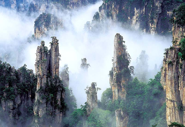 武陵源屬世界上罕見的砂巖風林地貌,整個景區(qū)內,溝壑縱橫,巖峰高聳,綠樹翠曼,獸鳥成群,有“大自然迷宮”、“天下第一奇山”這美譽。億萬年前,這里曾是一片波濤翻的海洋。歲月悠悠,滄海桑田。大自然威力無邊的“燕山運動”,將這里逐漸抬升為陸地、山脈、江河,隨后又以揮灑自如的鬼斧神工在這里“穿透切割”、“精雕細琢”,從而有了今天這般個有原始生態(tài)體系的砂巖、峰林、峽谷地貌,構成了溪水潺潺、奇峰聳立、怪石崢嶸的獨特自然景觀。