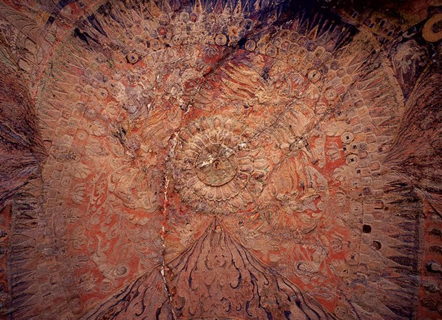 景明元年至正光四年(公元500-523)營(yíng)造,洞窟平面呈馬蹄形,穹隆頂,深12米,寬10.90米,高9.3米,正壁雕主佛釋迦牟尼坐像及二弟子、二菩薩,南北壁均一立佛二菩薩。佛、菩薩體態(tài)修長(zhǎng),表情溫和,神采飄逸,是北魏晚期風(fēng)行的“秀骨輕像”的典型代表。地面刻蓮花圖案裝飾,示意蓮花寶池??唔斨虚g浮雕一朵盛開(kāi)的大蓮花。版權(quán)所有山東聊城聊之旅國(guó)際旅行社有限公司,轉(zhuǎn)載必究!周?chē)邪松砑繕?lè)和兩身供養(yǎng)天,加之流蘇帷幔構(gòu)成一蓮花寶蓋。前壁有維摩詰變相、太子舍身飼虎圖,須達(dá)那太子施舍圖和皇后、皇帝禮佛圖(已被盜走)等大型浮雕圖像及十神王像。1978年為保護(hù)洞窟雕刻拆除磚卷門(mén)洞。使鮮為人知的四頭四臂、一頭四臂護(hù)法天重見(jiàn)天日。