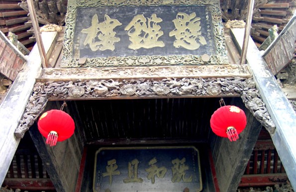 這分別是鐘樓和鼓樓,相對稱坐落于懸鎰樓兩側(cè),鐘樓內(nèi)懸大鐘一口,鐘高5尺,重2千余斤,人稱聚將鐘,亦稱“金鐘報曉”,鼓樓在西側(cè),內(nèi)懸掛更鼓一面。