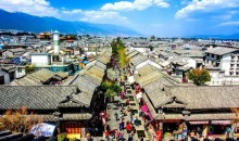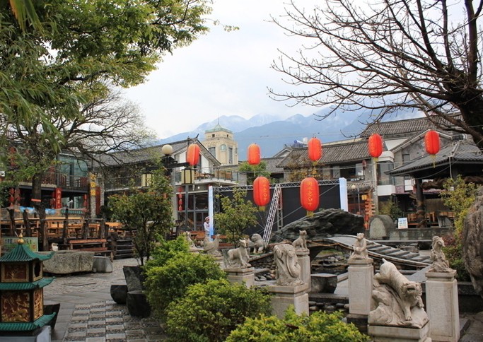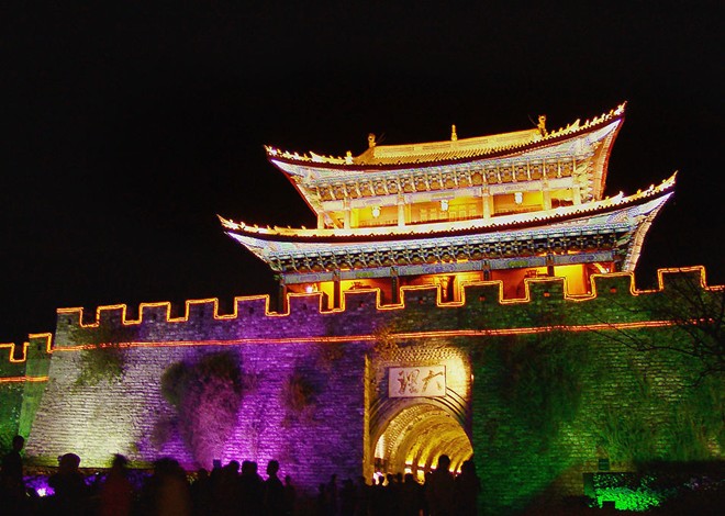 大理古城簡(jiǎn)稱葉榆,又稱紫城,其歷史可追溯至唐天寶年間,南詔王閣邏鳳筑的羊苴咩城(今城之西三塔附近),為其新都?,F(xiàn)在的古城始建于明洪武十五年(公元1382年),方圓十二里,城墻高二丈五尺,厚二丈。東西南北各設(shè)一門,均有城樓,四角還有角樓。解放初,城墻均被拆毀。1982年,重修南城門,門頭“大理”二字是集郭沫若書法而成。 由南城門進(jìn)城,一條直通北門的復(fù)興路,成了繁華的街市,沿街店鋪比肩而設(shè),出售大理石、扎染等民族工藝品及珠寶玉石。街巷間一些老宅,也仍可尋昔日風(fēng)貌,庭院里花木扶疏,鳥鳴聲聲,戶外溪渠流水淙淙。“三家一眼井,一戶幾盆花”的景象依然。古城內(nèi)東西走向的護(hù)國(guó)路,被稱為“洋人街”。這里一家接一家的中西餐館、咖啡館、茶館及工藝品商店,招牌、廣告多用洋文書寫,吸著金發(fā)碧眼的“老外”,在這里流連忘返,尋找東方古韻,漸成一道別致的風(fēng)景。