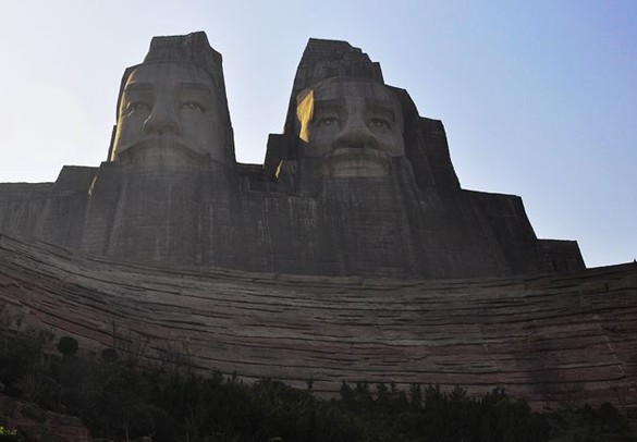是目前國內(nèi)最雄偉的雕塑之一。它依山就勢,以山為體,82米高的整座向陽山作為像身,再在山頂塑造18米高的頭像,總高達(dá)到100米。構(gòu)思新穎,獨具匠心,不同凡響。二帝坐南朝北,背依邙山,面對黃河。巨像前是一個開闊場地,周圍遍植松柏,中間建筑祭壇。祭壇至塑像的軸線上建有長200米的神道,兩側(cè)各列四座鑄銅大鼎,連同山前一座共九鼎,寓意九州四方江山永固。廣場東西兩端擺放大型編鐘、銅鼓各一個。