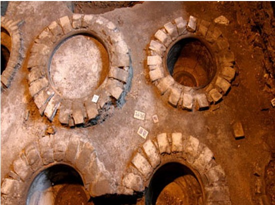 遺址位于李渡鎮(zhèn)紅石橋李渡酒廠老廠區(qū)內(nèi),元代至近現(xiàn)代燒酒作坊遺址。遺址考古勘探面積1600平方米,2002年考古發(fā)掘面積300平方米。揭露的文化堆積主要為元、明、清遺跡與遺物。其文化堆積的11個層面分為南宋、元、明、清、近代、現(xiàn)代6個時期,未見南宋遺跡,其余5個時期的釀酒遺跡有水井、爐灶、晾堂、酒窖、蒸餾設施、墻基、水溝、路面、灰坑、磚柱等。水井位于遺跡中心部位,始建于元代,后經(jīng)增高,深4.25米,六邊形紅麻石井圈,口徑0.66-0.72米,井臺三合土筑。爐灶始建于明代,紅石與青磚砌,長徑2.80米,短徑1.42米,殘高1.98米,煙道位于頭端兩側(cè);灶前操作坑呈“凹”字形,長2.70米,寬1.60米,深1?84米。晾堂2處,明代晾堂50平方米,清代晾堂40平方米,卵石與三合土筑,表面不平,邊界用紅石砌。酒窖22個,其中元代酒窖13個,直徑約0.65-0.95米,深約0.56-0.72米;明代酒窖9個,有6個至今仍在使用,直徑0.9-1.1米,深約1.52米。