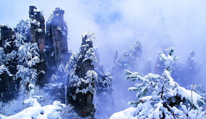 天子山還有云霧、月夜、霞日、冬雪四大奇觀。云霧,是天子山最多見的天象奇觀。有云霧、云海、云濤、云瀑和云彩等景象。久雨初晴之后或霏霏細(xì)雨之中,先是朦朧大霧,繼而形成白云,環(huán)繞飄浮。群峰在無邊無際的云海中時隱時現(xiàn),使人仿佛置身于蓬萊仙境之中。有時云霧從溪口涌出,爬過峰頂,然后以鋪天蓋地之勢,飛瀉而下,形成云瀑,十分壯觀。月夜,當(dāng)月明星稀,萬籟俱寂時,這里的峰林被朦朧月色披上了一層“魔紗”,似一群群魔影聳立在幽谷之中。耳聞禽獸嚦嚦的叫聲,使人產(chǎn)生一種神秘感。霞日,晴天的早晨,一輪紅日在朵朵紅云的襯托下,從奇山異峰中冉冉升起。千萬座石塔,婷婷玉立,披上一層紅霞,十分迷人。冬雪,入冬,天子山銀裝素裹,青松和峰頂被大雪覆蓋。此時的天子山冰柱倒立,冰花四散,只有一些山鹿、野豬,才不為銀白世界所征服。
