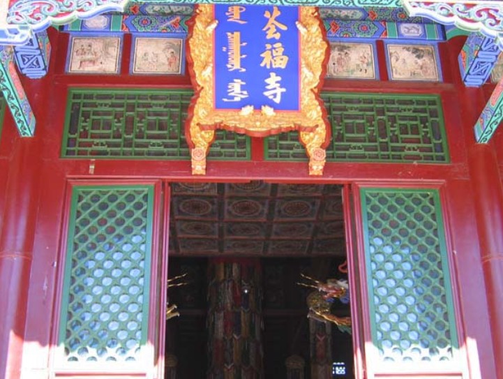 。共四十九間,高18米,占地面積620平方米,殿內(nèi)原有的《甘珠爾經(jīng)》、《丹珠爾經(jīng)》和建廟以來(lái)保存的主傳、經(jīng)卷、歷史籍、古幢、佛像、御賜金匾“金枝衍慶”(康熙帝書(shū)),“懿微堂”(乾隆帝書(shū)),“佛光普照”(嘉慶帝書(shū))都被1913年1月18日(民國(guó)二年十二月十二日)午后的大火燒毀。