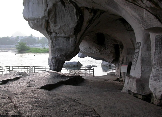 相傳古時(shí)有一老漁翁,在還珠洞拾得龍珠而惹怒海龍王,其興風(fēng)作浪,給百姓帶來(lái)災(zāi)害。后官府命老翁將龍珠歸還,方使天下太平,故此得名。洞內(nèi)玲瓏剔透,勾連曲暢,有唐人造像、宋代題刻100多件,其中宋代大書畫家米芾的題名、自畫像和詩(shī)人范成大的題詩(shī)堪稱珍品。洞的東面豁然開朗,洞口下面即是深不見底、碧波幽水的伏波潭。臨江有一石柱下垂,上粗下細(xì),底端有一寸多的空隙與地面相接,似被劍劈而開,堪稱鬼斧神工。傳說是伏波將軍試劍所致,故稱試劍石。有好奇的游人,都曾伏在試劍石下方的大石塊上,伸手摸一摸這奇妙的縫隙。 千佛洞從試劍石旁沿石階盤桓而上,可達(dá)千佛洞,內(nèi)有唐代摩崖造像239尊,加上僅有斧鑿痕跡尚未成形的共有400尊之多,成為唐代崇尚佛法,佛教盛極一時(shí)的標(biāo)志,具有很高的鑒賞和研究?jī)r(jià)值。