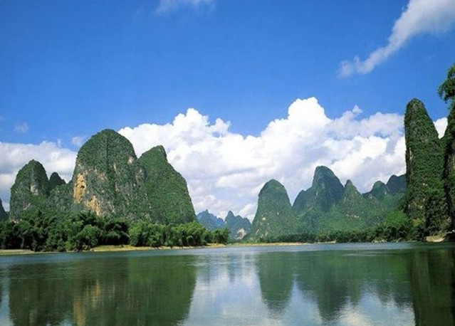 黃布倒影是漓江精華中的精華,位于漓江83公里精華段興坪古鎮(zhèn)境內(nèi),游船經(jīng)過楊堤,過了九馬畫山,江面逐漸開闊,水平如鏡,青峰倒影,美不勝收。離畫山之南不遠(yuǎn),便是黃布灘。漓江山色之美,美在倒影中;漓江倒影之美,就數(shù)黃布灘倒影最為醉人。這里江流清澈,碧綠透底,從水面上可以看到江底有塊米黃色的大石板,長、寬各數(shù)丈,恰似一匹黃布平鋪在河床之上,黃布灘由此得名。