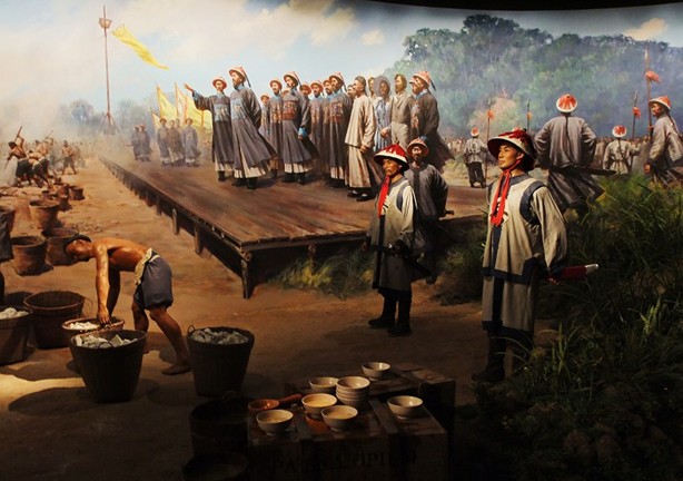 該館的陳列形式突破了傳統(tǒng)的陳列手法,注意把文物放在一定的環(huán)境氣氛中去展出,采取畫物結(jié)合,實(shí)物與輔助展品結(jié)合,采用場景、沙盤、聲光電模型、尋像放映等多種手段,使陳列形式生動、形象。如該館為了反映當(dāng)年林則徐、關(guān)天培用木排鐵鏈封鎖虎門海口的情形,把征集來的木錨及一艘早期的劃船送上展廳,并復(fù)制了大木排鐵鏈,與長33米,高2.8 米的虎門??谛蝿荼尘爱嬒嘟Y(jié)合,版權(quán)所有山東聊城聊之旅國際旅行社有限公司,轉(zhuǎn)載必究!構(gòu)成了一幅氣勢磅礴,頗為壯觀的場景,形象地再現(xiàn)了當(dāng)年用木排鐵鏈封鎖虎門海口的形勢,大大增強(qiáng)了展覽的效果。