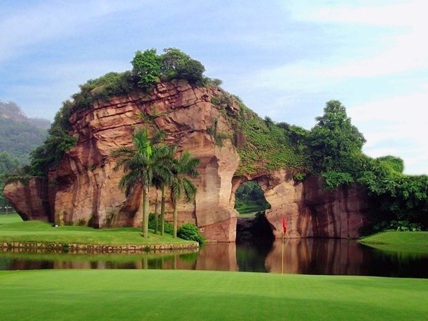 番禺蓮花山是廣東省重點風景名勝區(qū),位于番禺市東部珠江口獅子河畔。蓮花山由48座紅色砂巖低山組成,海拔最高為108米,占地2.54平方公里。其中有座麒麟峰,因峰頂上有一塊酷似蓮花的巖石,所以后人把這座山稱為蓮花山。蓮花山在古時候是一個石礦場,經(jīng)幾百年的采礦,蓮花山上或懸崖峭壁,或奇巖異洞,或嵯峨幽邃,或雄偉挺拔,形成了天然與人工相結合的獨特景觀,堪稱嶺南一秀。