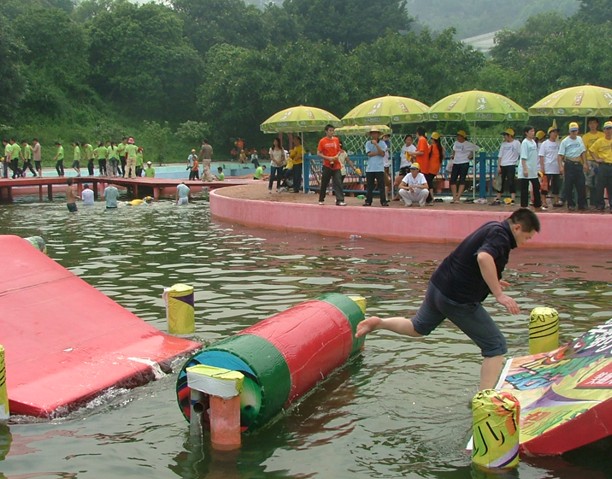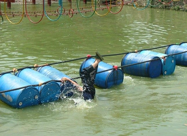 參訓(xùn)隊員必須從岸邊的起點(diǎn),利用空中的長繩蕩到水面的兩個1平米的平臺上,一個平臺站滿人后再轉(zhuǎn)移到另一平臺上,每個平臺目前最多可站26人。訓(xùn)練各級人員相互理解、互相包容,相互支持與緊密合作,打破隊員之間、男女之間、部門之間的隔閡,勇創(chuàng)佳績的決心和勇氣。