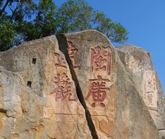 明萬(wàn)歷五年丁丑季夏(公元1577年)閩粵副總兵晏繼芳題刻的"閩廣達(dá)觀"大字正楷,陰刻、每個(gè)字大一米見方。