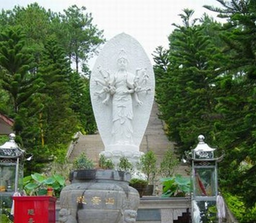 游人踏進(jìn)朱紅色的公園大門(mén),直抵觀音山麓??邕^(guò)草地,拾級(jí)而上的便是觀音山幸運(yùn)臺(tái)階,這是游客登高“迎幸運(yùn)”的最好去處。在大型臺(tái)階的平臺(tái)上,屹立一尊漢白三千手觀音像,一石成型,身高6.8米,重達(dá)8噸 是目前全國(guó)罕見(jiàn)的漢白玉觀音塑像,堪稱中華雕刻藝術(shù)瑰寶。