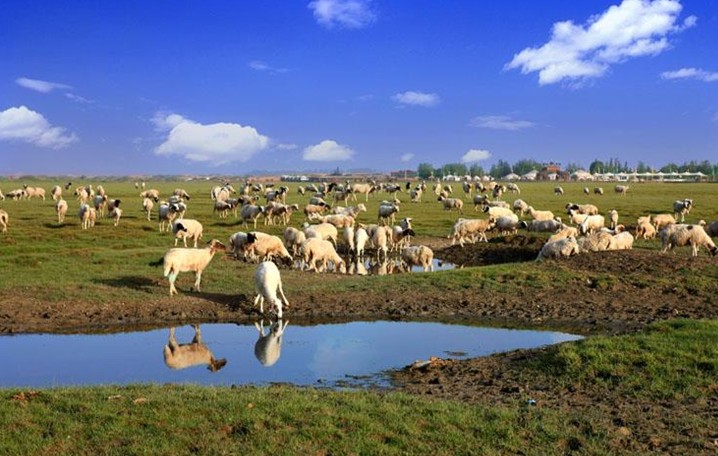 由駱駝山向南,進(jìn)入通湖草原。這里群沙環(huán)抱,綠草如茵,平湖如鏡,藍(lán)天白云之下,牧村、敖包、群群牛羊點綴其間,妙趣天成,如一塊碧玉鑲嵌在浩瀚沙海之中。
