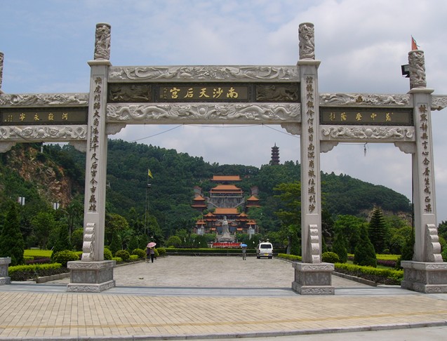 矗立在天后宮廣場巨大的天后石雕圣像,用 365 塊花崗巖石砌成,象征著天后娘娘在一年 365 天中都保佑著風調(diào)雨順、國泰民安。在廣場中央我們可以清楚地看到一條中軸線,南沙天后宮的建筑物都是依據(jù)這條中軸線而建造的牌坊原全國宗教協(xié)會主 席趙樸初 先生生前為牌坊題詞。穿過牌坊便到達山門。山門是天后宮的正門,室內(nèi)供奉是“千里眼”和“順風耳”這兩尊像神。南嶺塔塔高45 米 、共8 層。。與此同時,這塔的層數(shù)是 8 層,之所以是雙數(shù),與其它塔單數(shù)的不同,是因為民間傳說中有這么一條不成文的規(guī)定,即男神仙的代碼是單數(shù),女神仙的代碼是雙數(shù)。天后是女神,因此天后宮內(nèi),無論是階梯、瓦楞還是對聯(lián)的單聯(lián)(上聯(lián)或者下聯(lián))字數(shù),都是呈雙數(shù)的。山門是南沙天后宮的正門,門內(nèi)殿堂左右兩側(cè)分別站立著千里眼和順風耳的塑像,傳說他們被天后收服,成為給魚民預報海浪風濤信息的神靈。與鐘鼓樓相比粼的是碑亭,明成祖[御制弘仁普濟天妃宮碑]及鄭和[天妃靈應之記]碑,分立其中,兩碑文記述了明三寶太監(jiān)鄭和屢受天妃庇佑.完成七下西洋壯舉的經(jīng)歷. 獻殿在山門的正上方,殿中供奉官服天后立像,但見四海龍王執(zhí)圭在兩旁站班,顯示出天后作為海上女神的領(lǐng)導地位.使用宋代對天后褒封封號命名的靈惠樓,嘉應閣,位于正殿與獻殿之間的兩側(cè),這是天后文化的交流處所。山門兩側(cè)有鐘樓和鼓樓。鐘鼓樓內(nèi)的鐘和鼓都按時敲擊。每逢節(jié)慶期間,這里更是鐘鼓齊鳴,一派喜氣洋洋的氣氛。