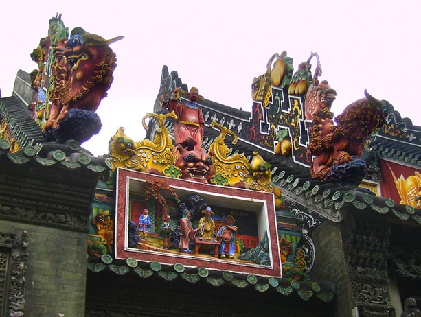 石灣陶塑脊飾。清代在南海、番禺、順德和香港、澳門(mén)等地的祠堂廟宇或富家豪宅中,正脊上大都用石灣燒制的陶塑脊飾。早期生產(chǎn)的脊飾,多用浮雕花卉圖案紋飾,隨著石灣陶塑的發(fā)展,浮雕花卉圖案紋飾逐漸轉(zhuǎn)變?yōu)闅v史故事和民間傳說(shuō)為題材的人物脊飾,這種石灣特有的陶塑脊飾文化,后來(lái)由廣東人帶往廣西、馬來(lái)西亞、新加坡等地。把自己家鄉(xiāng)的傳統(tǒng)文化傳往異國(guó),這正上鄉(xiāng)土情懷的自然表現(xiàn)。