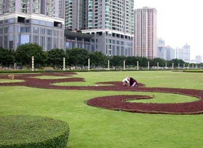 天河?xùn)|站綠化廣場(chǎng)位于廣州市新城市軸線(xiàn)上,占地面積4.7萬(wàn)平方米,于1998年9月中旬動(dòng)工,1999年7月1日正式完成并交付使用。廣場(chǎng)中央綠地2.6萬(wàn)平方米,鋪種馬尼拉草18315平方米,其中有6000平方米種植標(biāo)志性的紋樣,分圍種植1300平方米的福建茶綠籬。