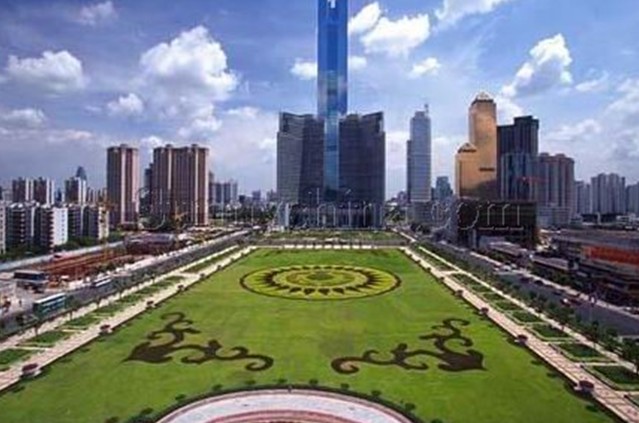 廣場(chǎng)的南面是廣州第一高樓中信廣場(chǎng)。中信廣場(chǎng)的主體建筑中信商業(yè)大廈是一棟甲級(jí)智慧型的商廈:主樓大堂入口處卓爾超凡,大堂樓高17.7米,配襯著優(yōu)質(zhì)花崗巖石,顯得格外富麗堂皇。除主樓外,兩翼還有藝術(shù)對(duì)稱(chēng)的兩棟38層副樓以及5層裙樓(為中天購(gòu)物城)。平面看來(lái),主樓四方形,中天購(gòu)物城的5層裙樓,呈半圓形,左右副樓則像電視卡通片人物伸出來(lái)的左手臂和右手臂。