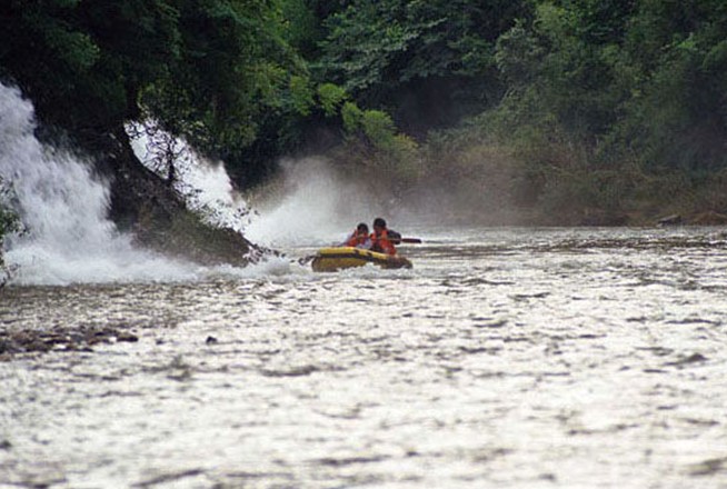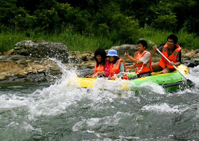 參加者坐上雙人漂流筏親自掌舵,投入大自然的懷抱隨水逐流,感受八公里激流險(xiǎn)灘連綿不斷的冒險(xiǎn)旅程。行程時(shí)而處于緩水中,此時(shí)你可盡情享受青山、綠水、藍(lán)天為您帶來(lái)的賞心悅目,或與同伴潑水嬉戲,其樂(lè)悠悠,但您千萬(wàn)別太陶醉,因?yàn)橄獫居胁簧偌绷麟U(xiǎn)灘,漂流者必須守望相助才能勇闖過(guò)去。